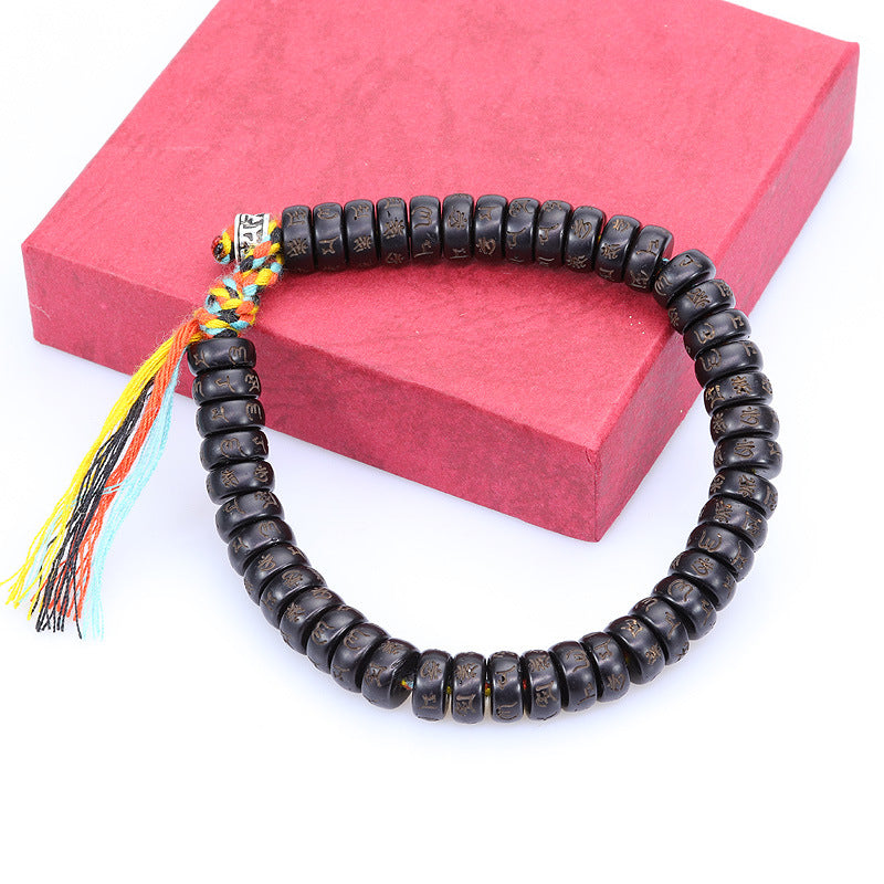 The Harmony Six Wisdom Coconut Bracelet blends beauty and positive energy. It's designed for comfort and confidence, made from black coconut shells for stability, and adorned with colorful knots for luck. It incorporates a six-letter word symbolizing wisdom, peace, and insight. This piece of jewelry bridges Tibetan wisdom with modern design, promoting cultural understanding and respect. It's more than a bracelet; it's a cultural messenger, encouraging a life attitude that harmonizes ancient wisdom with the modern world.